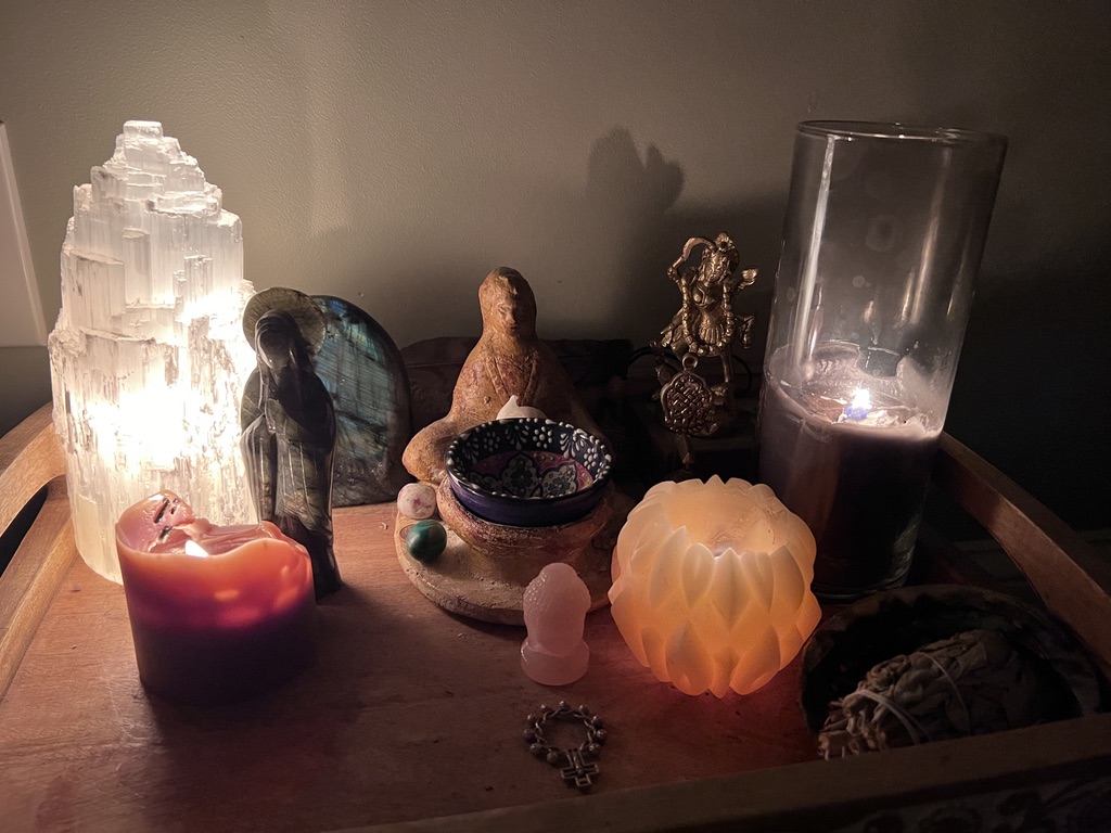 Meditation is a great way to practice witnessing our thoughts and is a profound tool for self awareness. I love to curate a beautiful altar to use for inspiration and reflection in my meditation practice. A favorite element that I especially enjoy is a selenite lamp on my altar where I meditate. It adds a soft glow and a focal point when I need it. Having a beautiful warm space to return to day after day is something that will have you looking forward to your contemplative time.