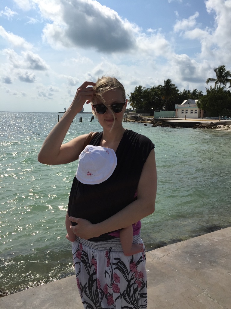 I carried her through the airport and wore her on the plane ride as well. This version has a mesh cotton fabric so it was very breathable and cool – other than the fact that I chose the color black. She was 4 months here, and side note this is a great time to travel with baby. I was exclusively breastfeeding so we didn’t need to bring any bottles or baby feeding gear.