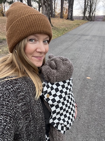 I ended up finding my perfect carrier which was by a new brand, MABĒ. The MABĒ Monarch Buckle Carrier seemed to fit all of my needs. It’s stylish with many cute print options, it comes in a linen cotton blend fabric, and the price point was right on target for me. I chose the black and white checkered carrier and I love how I can share it with my partner and it can be adjusted to fit him just as perfectly as it fits me. The fabric was a little rough at first which is to be expected with a linen cotton blend, and it has gotten softer with each wash.