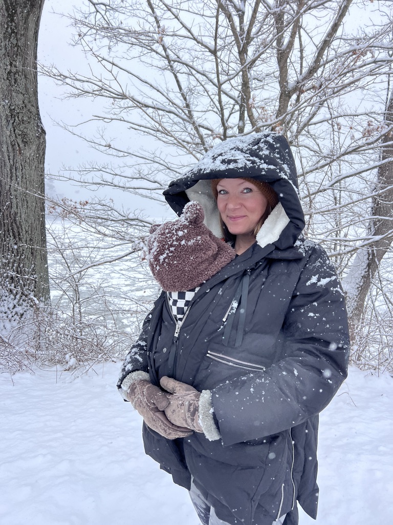 This has been hands down the best winter purchase I’ve made this year. It is an oversized thick goose down coat with zippers on each side which allow you to open it up and expand it to a larger capacity. I normally wear a size small, so I sized up to a medium and can easily wear the baby with the sides fully unzipped. Here we are on a snowy walk last month and we were both toasty warm. This coat has a ridiculous number of zipper pockets and I find that I end up using it as a purse if I am making a quick run into a store. I throw a card/cash in one pocket, my phone in another, keys in another and an extra binkie of course. This has been such a great coat this winter and I am sure that I will be able to wear it just as well next winter with the sides zipped